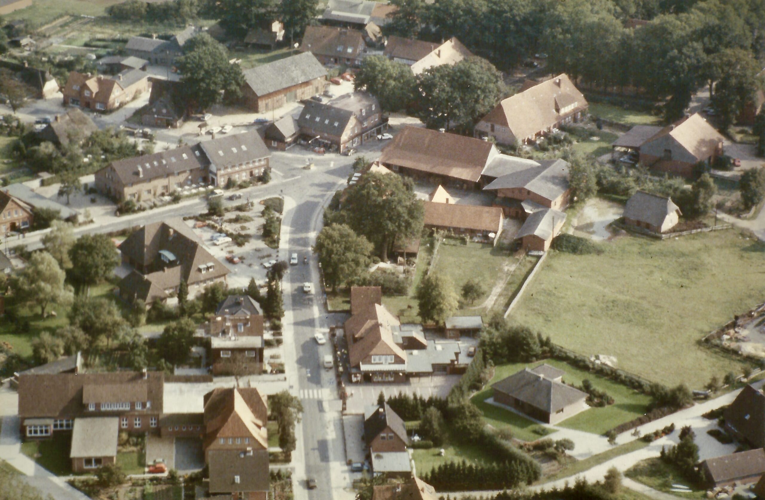 Ein Luftbild von Egestorf aus 1982. Im Vordergrund links die alte Grundschule, rechts die „Felldiele“ vor ihrem Abriss. Ebenso ist noch das alte Sparkassengebäude zu sehen, hinter dem Egestorfer Hof. Man beachte die geänderte Verkehrsführung an der Kreuzung Richtung Garlstorf.